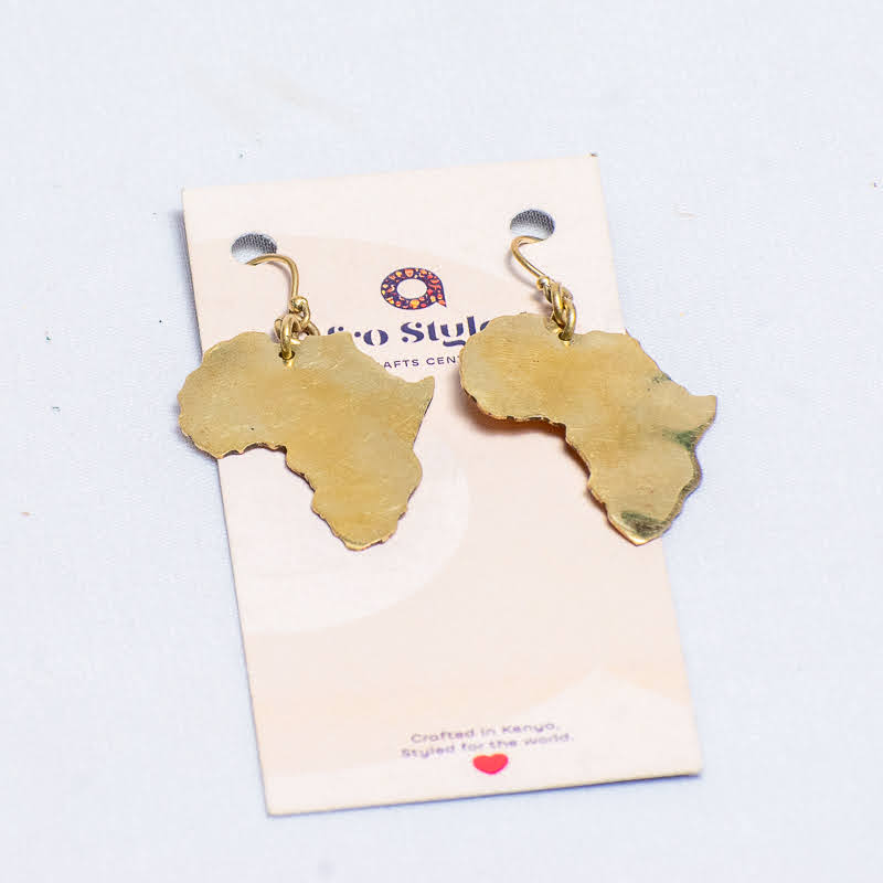 Symbolic handcrafted brass earrings shaped like the African continent,celebrating heritage and identity.