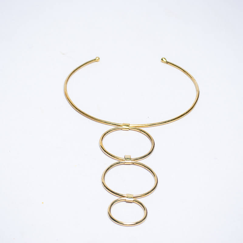 Statement brass choker with three graduated circular loops in a linear arrangement.