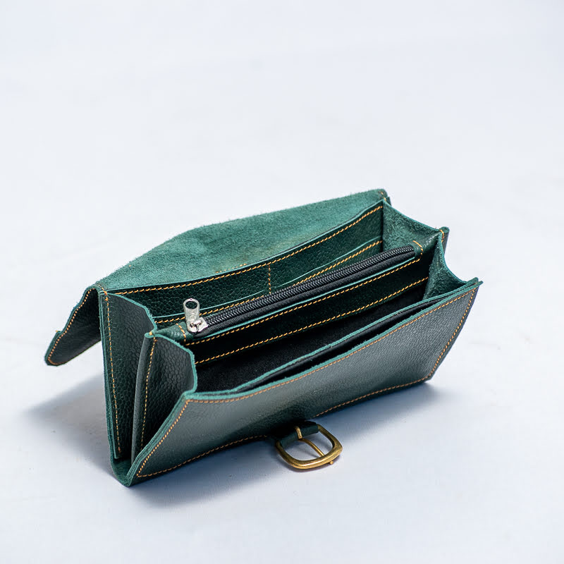 Dark green leather clutch wallet with buckle strap closure,Has compartments inside and a zip.