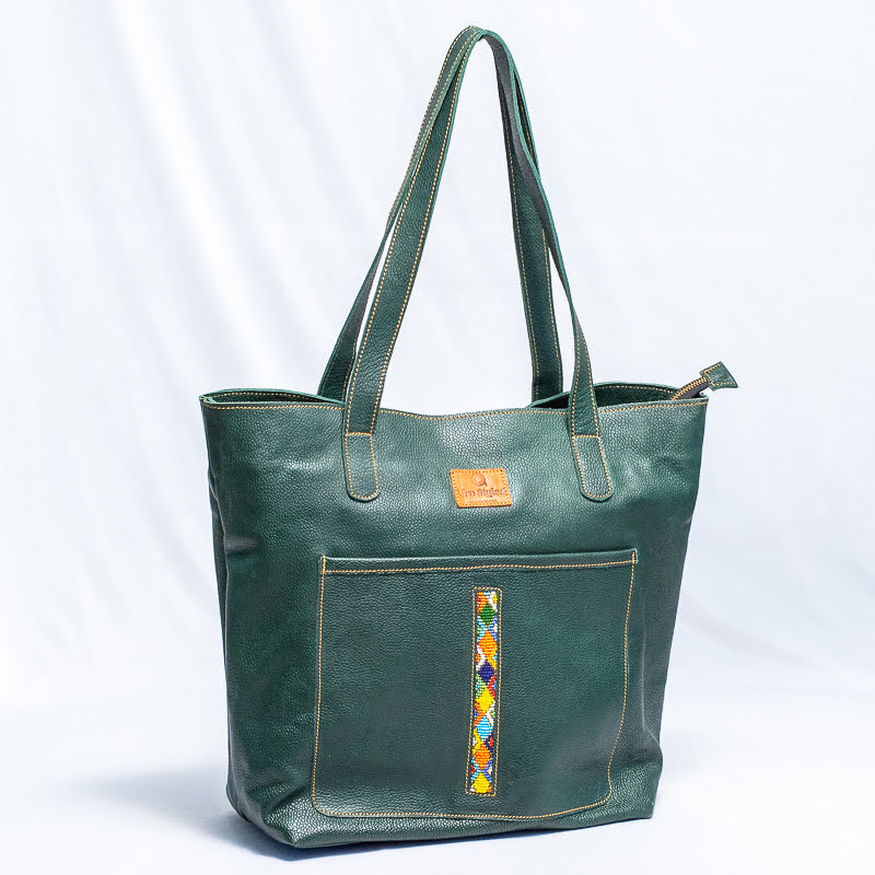 Dark green handcrafted leather tote bag with sturdy leather handles and a front pocket featuring subtle African-inspired detailing.