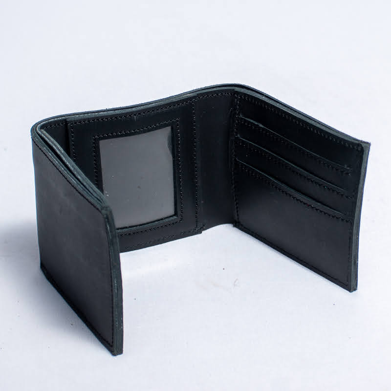 Black leather trifold wallet with card slots,ID window and stitched interior compartments
