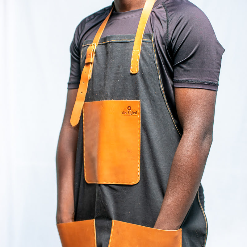 This black canvas apron with front utility leather pockets is designed for durability,comfort and everyday functionality.Made from strong canvas fabric and finished with genuine leather straps and pockets,it offers both protection and style.Ideal for chefs,baristas,artists and craftsmen,the apron provides easy access to tools while maintaining a clean,professional look,