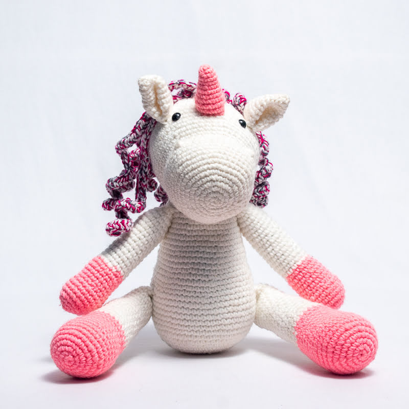 Handmade crochet unicorn soft toy in white and pink with a textured horn and curly yarn mane.