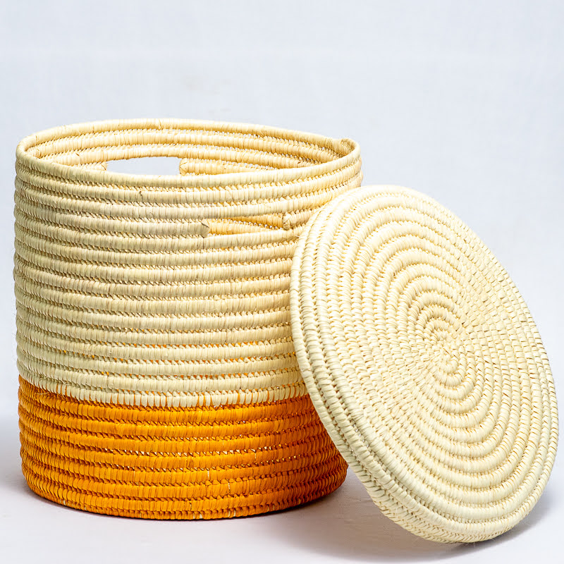 This handcrafted cylindrical basket features a vibrant spiral pattern in earthy beige,natura fiber and warm orange tones.Topped with a matching lid,it is both functional and decorative-perfect for storing small items or adding artisanal charm to any space.Made using traditional weaving techniques,each basket celebrates the beauty of craftsmanship and cultural design.