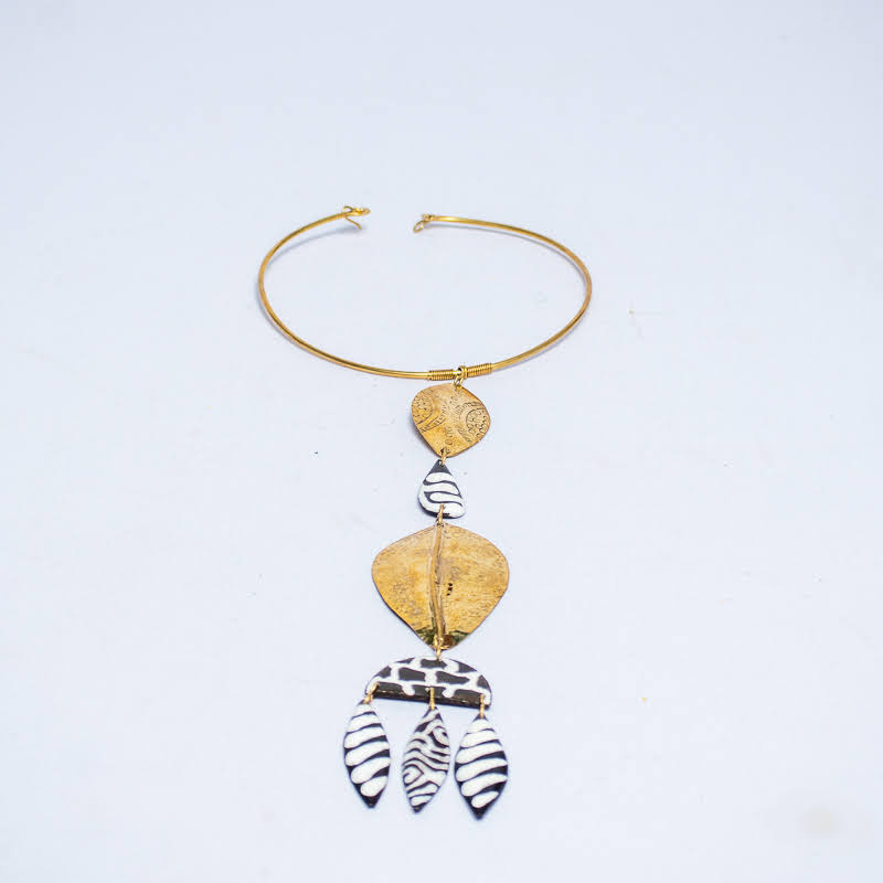A striking handmade necklace featuring a brass choker paired with layered leaf-shaped pendants.The design blends natural earthy tones with bold black-and-white patterns,creating a statement piece inspired by African industry and organic forms,Perfect for elevating simple outfits with a touch of culture and elegance.