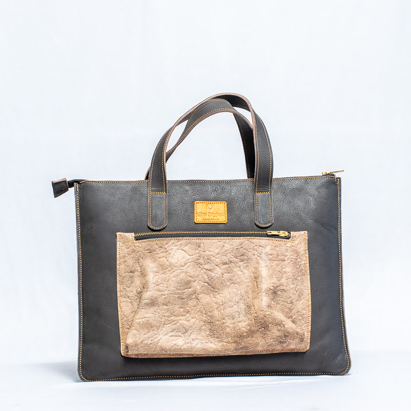 Two-tone leather tote bag for women with sturdy leather handles and a front beige leather pocket,handcrafted in a minimalist design.