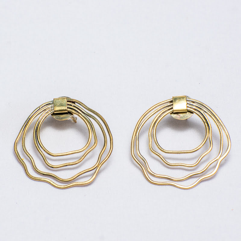 Layered circular brass earrings with organic wavy rings and a polished finish.